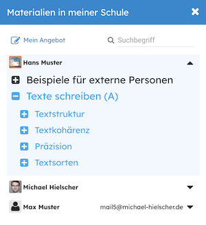 Über Mein Angebot kann gewählt werden, welche eigenen Materialien für die Kolleginnen und Kollegen zur Verfügung gestellt werden.
