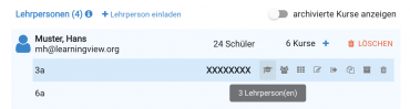 - Zeigt die aktuellen Lehrpersonen im Kurs und ermöglicht das Hinzufügen oder Entfernen von Lehrpersonen und deren Berechtigung.