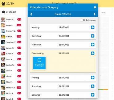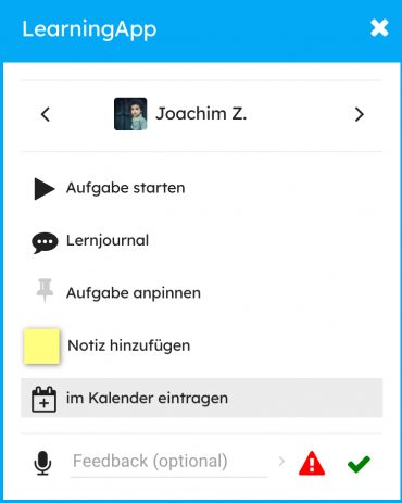 Die Lehrperson kann den Kalender einsehen und Einträge stellvertretend für die Schüler/innen hinzufügen. Über den lässt sich eine individuelle Aufgabe/Eintrag für den gewählten Schüler anlegen. Die Lehrperson kann Aufgaben aus dem Kurs für einen Schüler/in im Kalender eintragen. Grundsätzlich sollte dies aber durch die Schüler/innen selbst erfolgen.