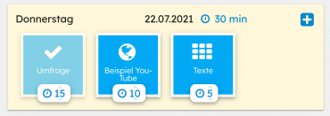 Zusätzlich kann über "Zeit anzeigen" eine geschätzte Zeitdauer für jede Aufgabe definiert werden. Wurde bei der Aufgabe selbst bereits eine Zeitangabe hinterlegt, wird diese als Vorschlag voreingestellt und kann individuell angepasst werden. Die Zeiten können vom Schüler jederzeit erneut angepasst werden.