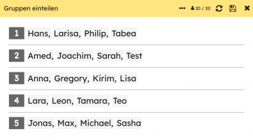 Über oben rechts kann eine neue Gruppenzuteilung zufällig bestimmt werden. Die gewählte Zuteilung kann über am Kurs gespeichert werden. Alle gespeicherten Zuteilungen stehen allen Lehrpersonen im Kurs zur Verfügung.